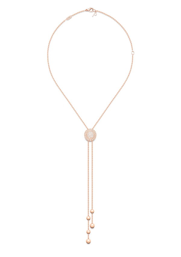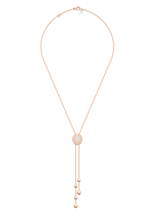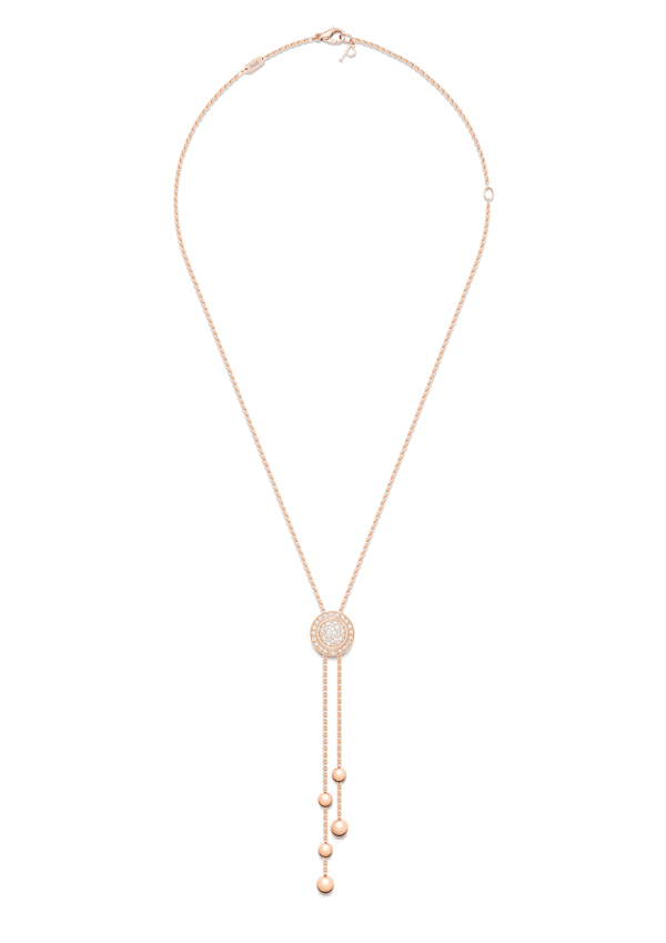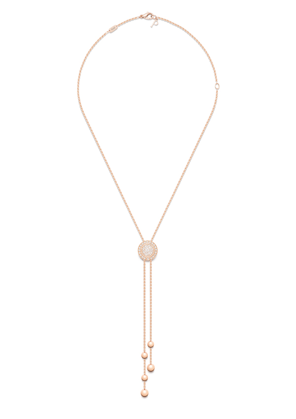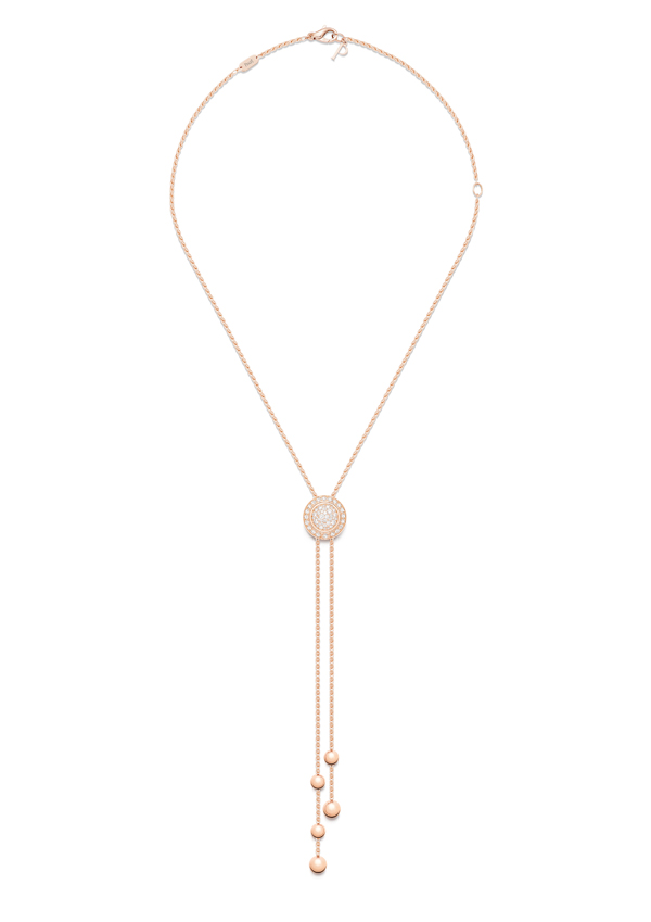 这款18K玫瑰金的Piaget Possession 时来运转项链(G33PE500),搭配可上下滑动的圆弧形密镶美钻坠饰,钻石镶嵌可旋转圆环将坠饰环绕其中,项链末端分别饰有 2 颗和 3 颗玫瑰金圆珠(共5 颗),镶饰55 颗明亮式切割美钻(约重 0.68 克拉)。